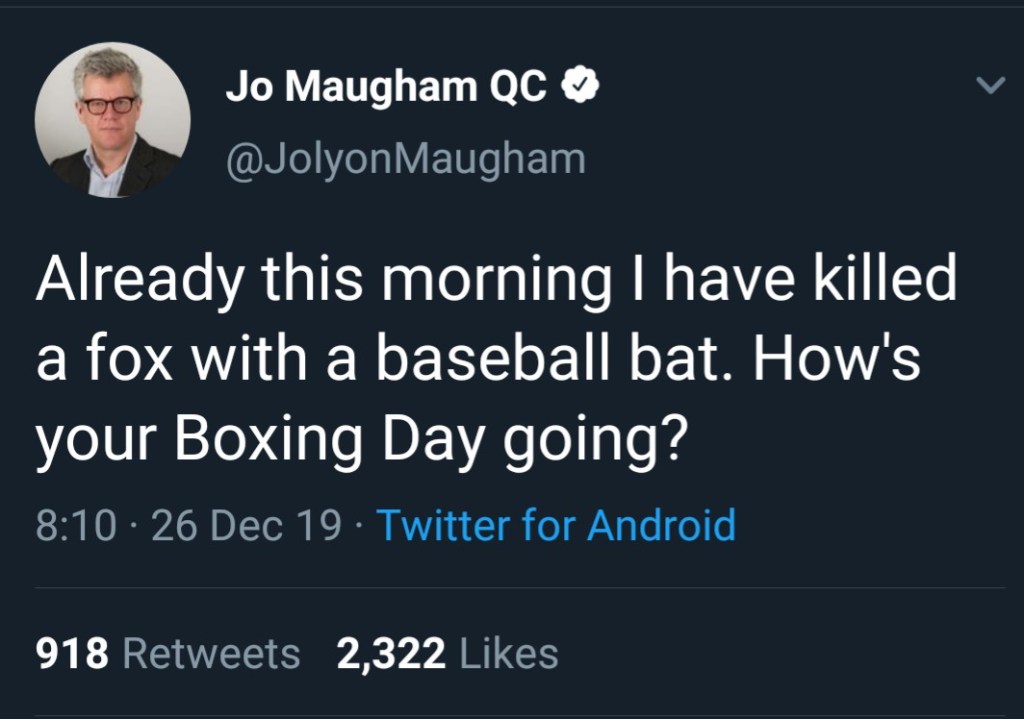 Prominent Remain lawyer Jo Maugham QC was out in his back garden, too-small-satin-kimono-clad, duly dispatching a wild fox that had strayed into his chicken complex (no pun intended).