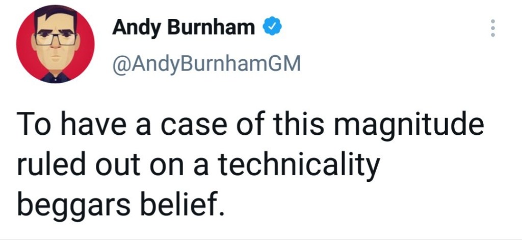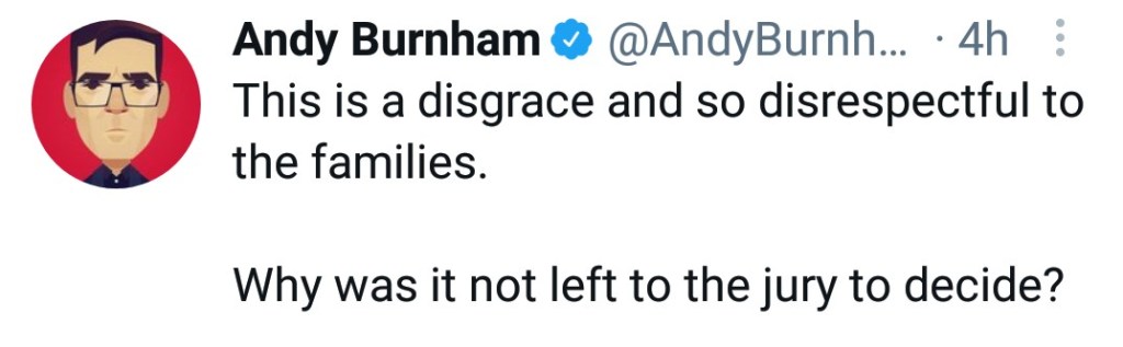 Labour nightmayor Andy Burn’em, who was boisterously stepping beyond his Manchester remit, reacted to the Hillsborough court verdicts with similarly fact-devoid consideration: