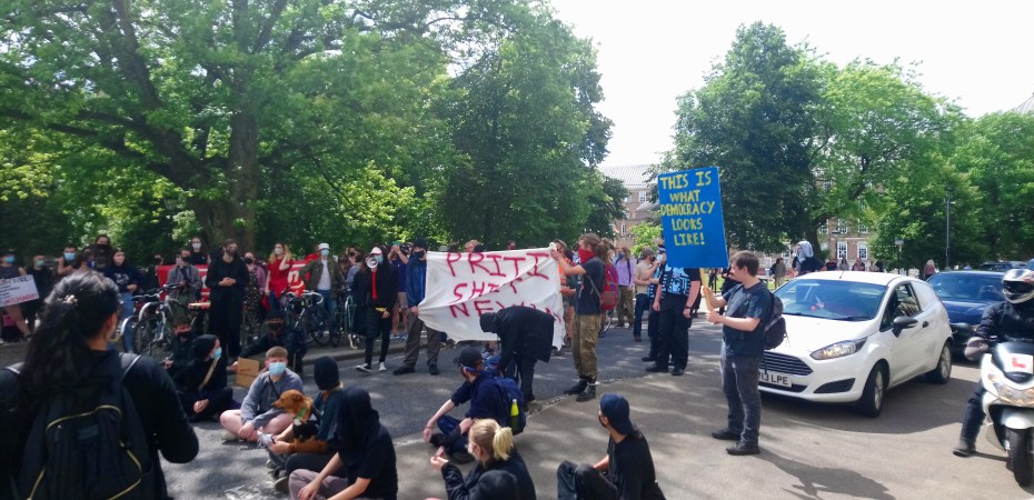 They had a banner reading, ‘Priti Shit’, which does deserve some recognition for a new twist on an old gag, and another which read, ‘this is a peaceful protest’.