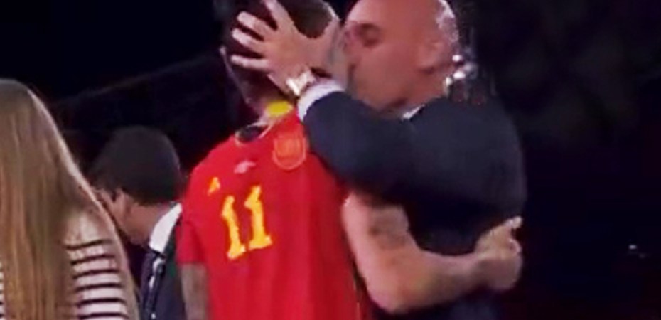 Following their ‘world cup’ victory, triumphant Spaniolo player Jenni Hermoso hugged her FA President Luis Rubiales, lifted him legs akimbo aloft while the hapless prez reciprocally offered a lips-on kiss to the hopeless lez.
